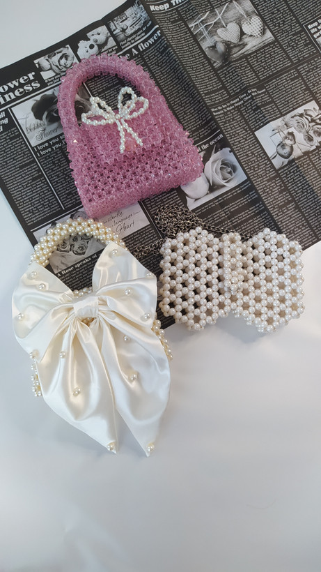 M کیف مرواریدی پاپیون دار سایز متوسط. موبایل جا نمیشود. مناسب چند وسیله ساده است در رنگبندی که می پسندید.بافته شده با مهره های ایرانی. با مهره های وارداتی ۱۷۰ بیشتر