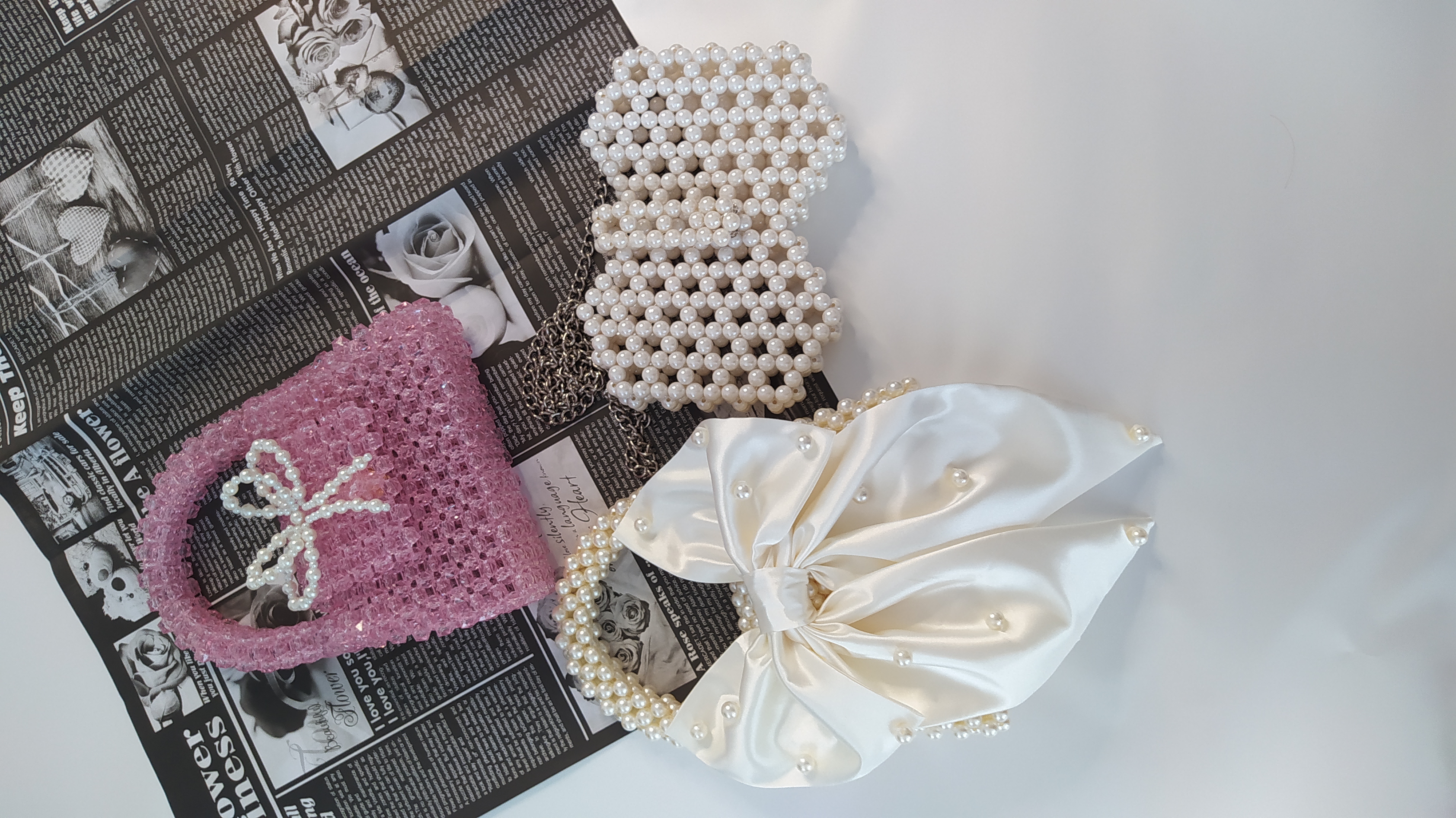 M کیف مرواریدی پاپیون دار سایز متوسط. موبایل جا نمیشود. مناسب چند وسیله ساده است در رنگبندی که می پسندید.بافته شده با مهره های ایرانی. با مهره های وارداتی ۱۷۰ بیشتر